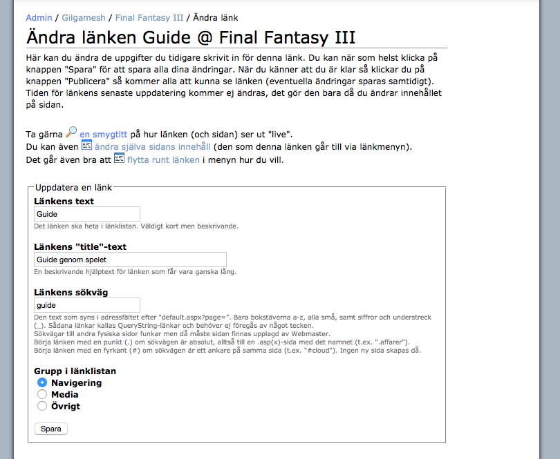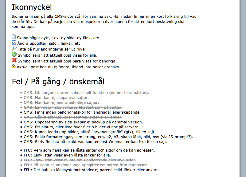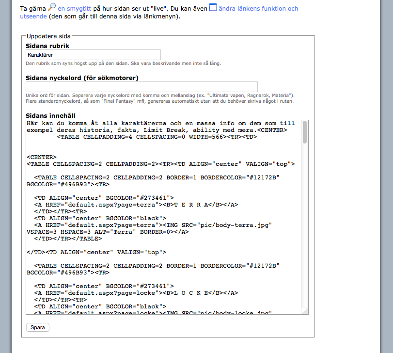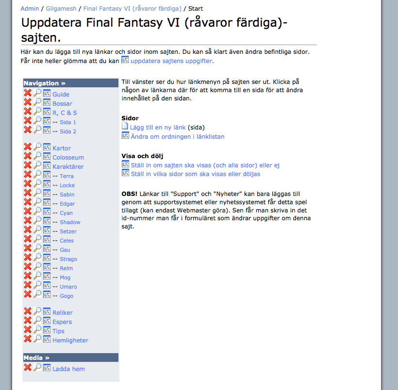 Men det blev aldrig färdigt. Inte ens i närheten av. Vi körde ut FF12 och FF13-sajterna i systemet. De funkade. Men det var fortfarande rätt hopplöst att jobba i. Man kunde inte jobba på en sida i smyg, som ett utkast, utan allt publicerades direkt man sparade nåt. Och väldigt få tekniska saker var annat än manuellt jobb, som att sen publicera sajten. Skulle man göra sidor med tabeller och/eller bilder så var man tvungen att knacka ren html-kod.