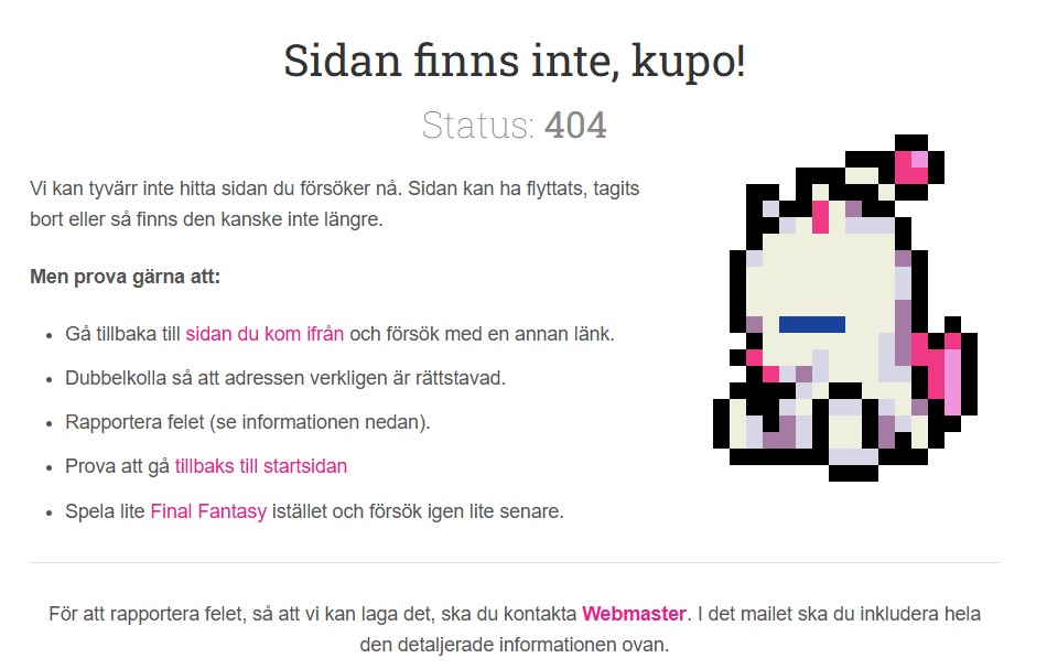 Alla fel på alla servrar får nu samma felsida, förut fick varje subdomän en egen. Nu är det samma. Denna gång med en smula justerad design, och tydligast av allt - en fin söt ikon på en trist Moogle. Lite mer passande än Magic Urn som vi kört med i många år, även om den också är kul.