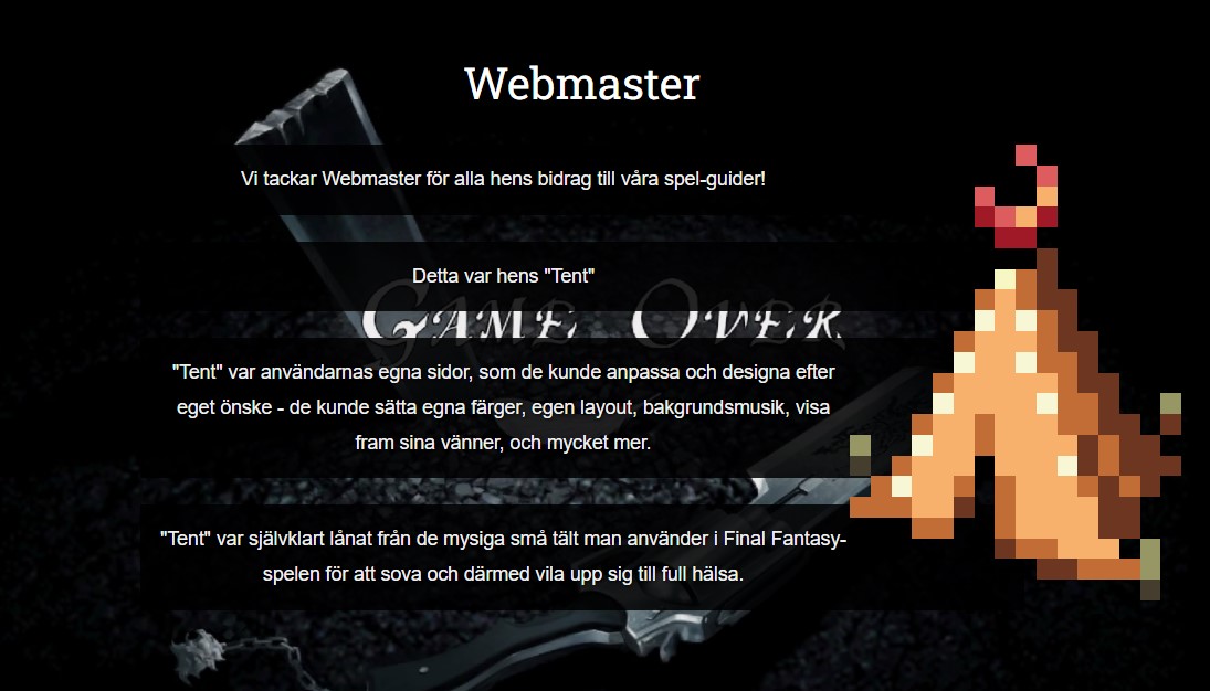 Vi har fått mängder av bidrag på content här. Alla de har länkat vidare till gamla Tent-sidan på communityn som var /community/user_user.asp?user= och dessa har i många år fått 404-fel. Och det är lite tråkigt för alla som bidragit till oss och har sina länkar spridda på våra sidor. Så nu gjorde jag en enkel men fin Game Over-aktig Tent-sida till dem alla.