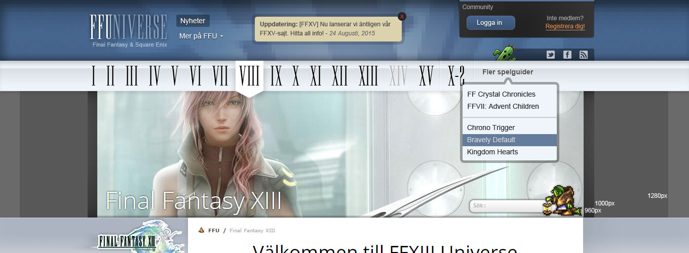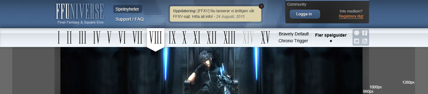 Sociala länkarmenyn fick flytta upp igen, men nu lite ändrad. Den är nu mer ren, ingen text, bara ikoner, och mer luft. Samtidigt la jag in kära Cactuar där. Det är dels än fin färgklick, en känd FF-symbol, och något som drar ögonen tills sig. Den får nya besökare att lättare upptäcka Communityn, de sociala länkarna, och “Fler spelguider”-menyn.