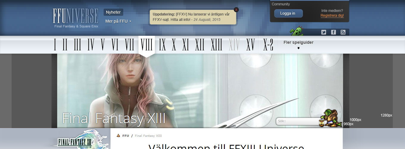Med allt detta extra utrymme kunde jag ge mer luft runt logon, sajtlänkarna, nyhetsboxen, och under communityn (men där klämde jag nu in social-menyn). Sajtlänkarna har också ändrats lite. Det står nu bara “Nyheter”, kort och gott. Och under “Mer på FFU” med en pil. Detta är inte designat än men jag tänker mig en liten drop down där jag kan lista länkar till FAQ, extra länk till Communityns startsida, Sök, Blogg, och liknande. Det är en del som kan behöva få plats där uppe men som bara grötar till det om det ska skrivas ut, så det får lämpas in i en utfällbar meny helt enkelt.